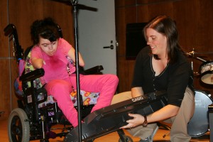 Below: Matheny student Bozena Geraghty uses her feet to play the keyboard, assisted by music therapist Alissa West.