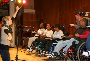 Above: Music therapist Megan Chappius conducts the Matheny Muses as they perform Lady Gaga’s “Just Dance.” From left, students Yasin Reddick, Bianca Mathis and Jameir Warren Treadwell; music therapist Greg Perkins; and student Najee Rogers.