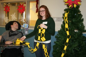 A group of employees from the Hartford Insurance Company, located in Florham Park, NJ, recently spent an afternoon crafting holiday decorations with adult patients at Matheny. One of the patients, Kevin White, received a big assist while decorating the tree from Hartford employee Amanda Rafferty.