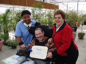 Josh Handler, an adult who lives in one of Matheny’s community residences, was recognized at Arthur & Friends’ recent Christmas party when he was presented with the organization’s Indomitable Spirit award. “He was selected by his peers,” says Wendie Blanchard, program director, “because he has the most ‘can do’ attitude we’ve ever seen. There is nothing he won’t try.”