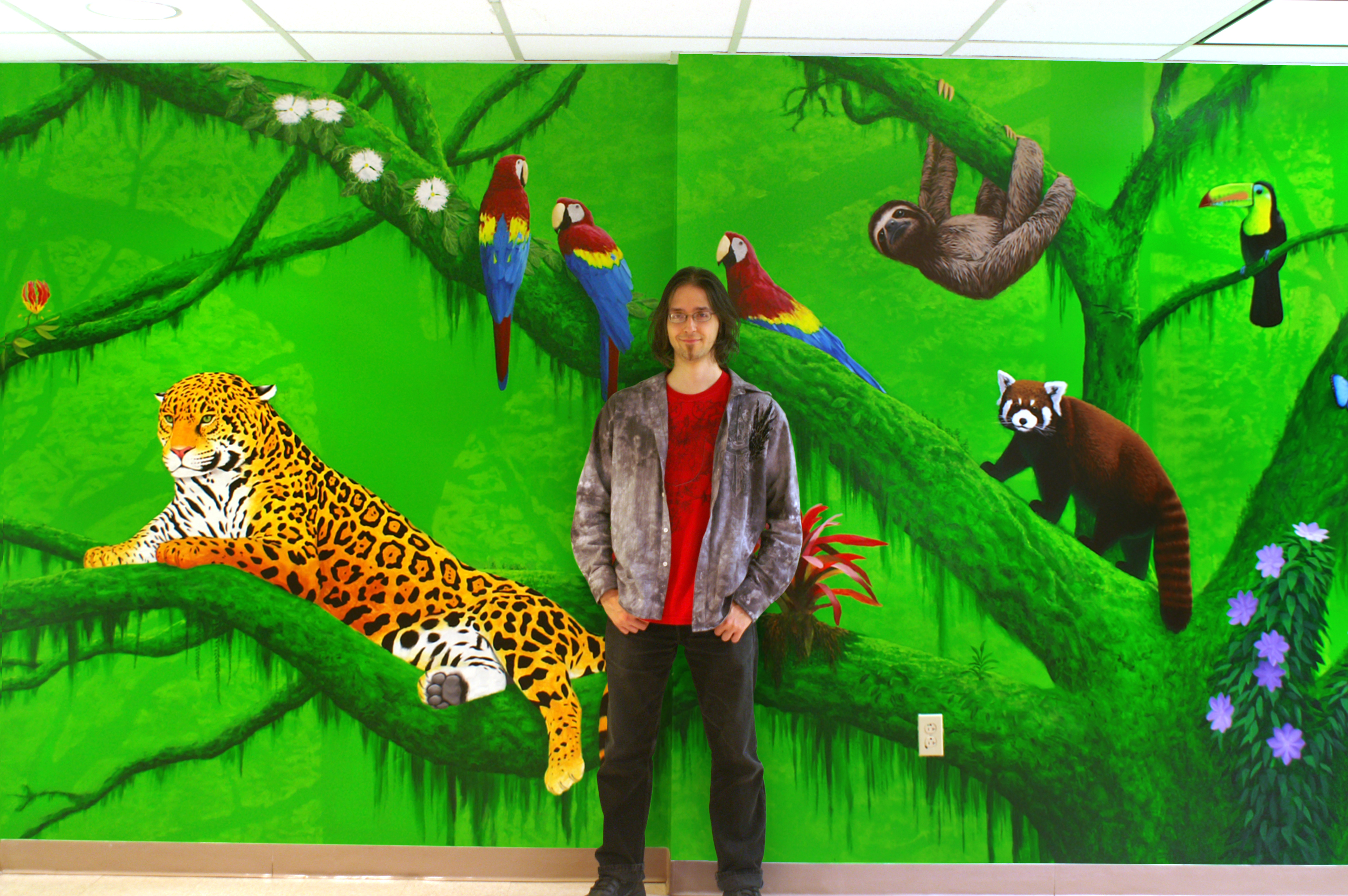 The painting, which has a rainforest theme, was completed in September 2011. The rainforest idea, he says, “seemed like a universal thing that most of the kids would get excited about. I thought it could also be used as a teaching tool. I researched the rainforest and made sure that all of the animals that I chose for the mural are found in the rainforest. Also, each of the plants is a rainforest climbing plant that actually grows on trees the way I painted it. As I was aware of the visual challenges faced by some of the children, I used a lot of contrast to make the image as clear as possible for them.”