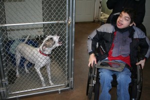 Below, 19-year-old student Mark O’Connell visits with Chriss, a pointer.