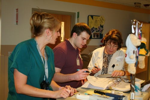 Sussex/Passaic Community College nursing student Mitchell Klein, center, reviews a patient’s chart with Matheny nurse Carrie Fordham, left, and Sussex/Passaic CC nursing instructor Linda Zenkert.