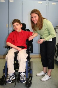 Julie Gordon with Scott in his classroom.