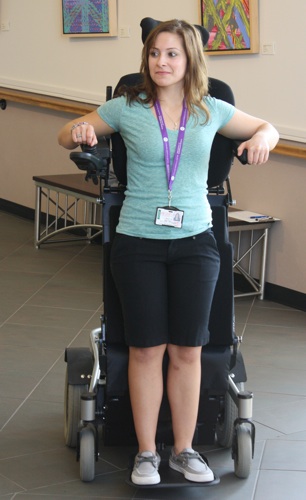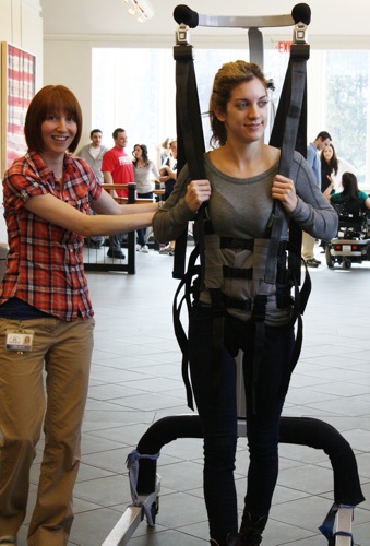Alexis Reynolds familiarizes herself with a gait trainer, a walker that supports patients who cannot hold themselves in a standing position. At left is Matheny physical therapist Tara Wach.