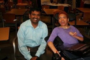 Using an automated communications device, Arts Access artist Natalia Manning told a roomful of Johnson & Johnson employees what creating art means to her. The occasion was the opening reception for a special exhibition of Arts Access artwork at the J&J Information Technology Building in Raritan, NJ. More than 50 works of art created by 20 Arts Access artists are on display through the end of October on all four floors of the building. The exhibit includes paintings, digital art and sculptures.