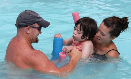Phys ed teacher Jim Hintenach and physical therapist Erin Guidera help student Jenna Poleyeff manage the pool noodles.