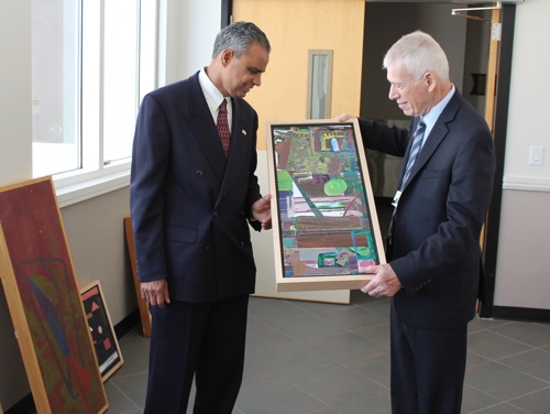 Assemblyman Upendra Chivukula, left, and Steve Proctor, Matheny president, admire an untitled painting by Arts Access artist Michael Martin.