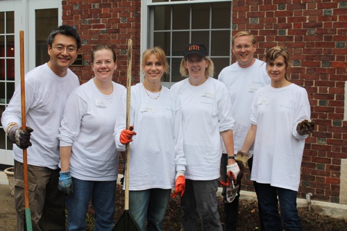 Raking leaves and helping to spruce up the courtyard outside the Matheny Center of Medicine and Dentistry were these Novartis Pharmaceuticals Corporation volunteers. From left: Sewhan Chon, Karin Hunziker, Ana Bastiani-Posner, Holly Crosbie-Foote, Duncan McKechnie and Lori Tempsick.
