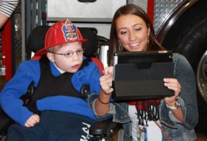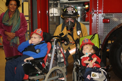 Volunteer firefighter Thompson Ross, fully outfitted as if he were getting ready to fight a fire, visits with Matheny students Nicholas Barros, left, and Jack Harter. Ross, a Peapack-Gladstone resident, is an emergency medical technician (EMT) in Cedar Knolls, NJ. At left is Matheny personal care assistant Mulualem Yihune.