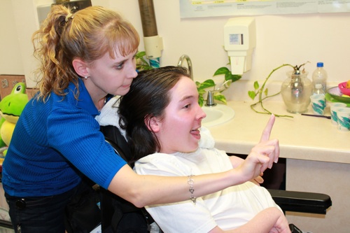 Gaudreau is learning how to use this technology with assistance from Matheny speech-language pathologist Christine Mayercik. For example, he chooses Taylor Swift and Gangnam Style music videos over a video clip of President Barack Obama appearing on the David Letterman Show. “You need to look for two green lights,” Mayercik advises Gaudreau. “Then an arrow will take you to the next screen, and the finger pointer will take you to the video.”