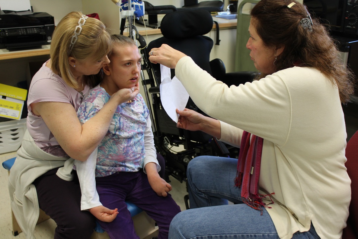 Darlene Tammara uses picture symbols to make a story more understandable to student Deborah Eike. At left is occupational therapist Debbie Goodheart.