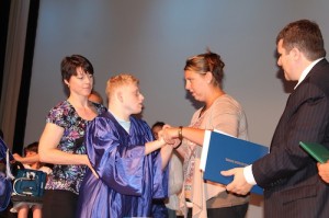 Physical therapist Erin Meineke, left, and teaching assistant Katie Wertheim help Bryan Desatnick 'walk' to receive his diploma from principal Sean Murphy.