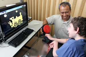 Matheny student Michael Taurozzi uses a switch to access a computer, assisted by OT Wendell Lumapas.