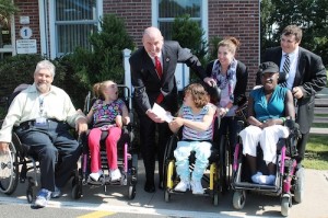 From left, Ken Brucato, student Deborah Eike, Kevin Ralph, student Tasha Santiago-Keefe, speech-language pathologist Brynna Cunningham, student Raven Bennett and Matheny School principal Sean Murphy.
