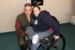Last month, students in Matheny’s adult services program coordinated a drive among Matheny employees to collect items for “virtual” baby showers for the wives of wounded warriors who are at Walter Reed. When the students made holiday cards to be sent to U.S. servicemen and women, they felt there was no better place to send them than to the Marines Care Foundation at the L/CPL Robert J. Slattery Detachment. Gunnery Sergeant Mario Monaco, who had been at Matheny previously to pick up the baby shower items, made a return visit to pick up the holiday cards. He brought personalized certificates of appreciation for each of the Matheny adults, and he spent time regaling them with stories about some of his adventures in the Marines.