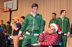 The physical education and recreation therapy departments at Matheny created an assortment of basketball games designed to level the playing field, and the Delbarton players either competed against the Matheny players or helped them compete against each other. They also tossed T-shirts into the audience in the Robert Schonhorn Arts Center and displayed some of the skills they use against their regular opponents.