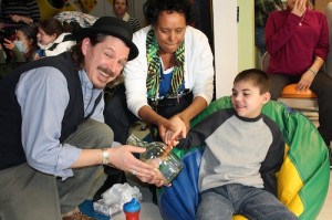 Matheny student Ryan O’Connor makes music with a bottle, held by Zach Green as personal care assistant Mulu Yihune looks on.