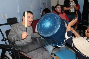Matheny student Ryan O’Connor makes music with a bottle, held by Zach Green as personal care assistant Mulu Yihune looks on.
