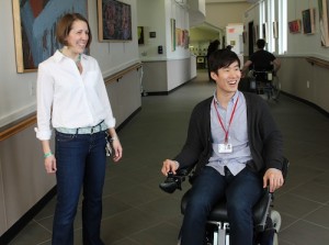Rutgers student Dongmin Park of Palisades Park, NJ, tries out a power wheelchair as Cindy Labar, Matheny director of physical therapy, looks on.