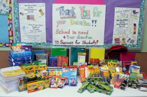 With that in mind, Matheny School students mounted a campaign to collect school supplies from Matheny employees that would, in turn, be donated to Roosevelt’s YSS program. The drive was an unqualified success! Doing some math, with the help of manipulatives (objects such as blocks that are used to help students learn math concepts) and calculators, Matheny students determined that the supplies collected included 52 packs of pencils, 75 glue sticks, 176 markers and 65 notebooks.