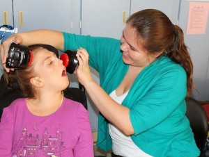 Centenary student Jessica Mistrey learns how to use switches to help a nonverbal student communicate.