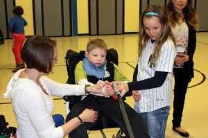 A Matheny student demonstrates adapted hockey to a student at the Old Farmers Road School in Long Valley, NJ. At left is Cindy LaBar, Matheny director of physical therapy.