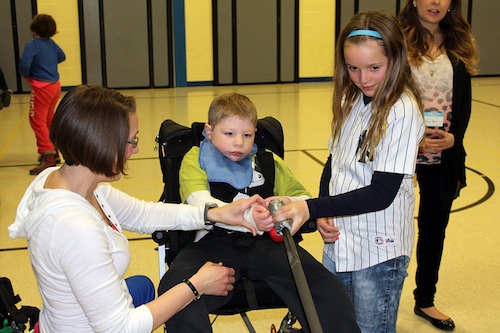 A Matheny student demonstrates adapted hockey to a student at the Old Farmers Road School in Long Valley, NJ. At left is Cindy LaBar, Matheny director of physical therapy.