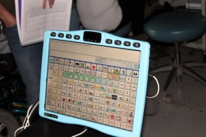 Chet uses a communication device called the ECO2, produced by the Prentke Romich Company, a member of a consortium of companies that provide language and assistive technology products and services to people with disabilities. Chet accesses his device by using a single switch placed on his laptray. The device auto scans through the icons, and, when a light gets to the icon he wants, he hits his switch to activate the area.