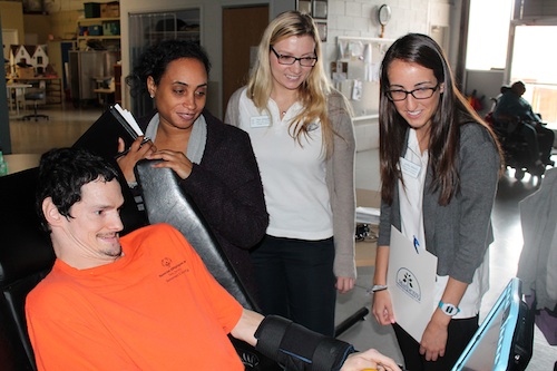 “What happens when a mailman gets old? He loses his zip.” That’s one of several riddles programmed onto Chet Cheesman’s communications device, which he demonstrated to three nursing students from Seton Hall University, who were visiting Matheny’s Adult Learning Center in Hillsborough, NJ. It’s part of the community nursing program at SHU that requires Bachelor of Science in Nursing candidates to spend time in a variety of community nursing settings.