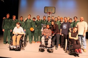 The Delbarton basketball team and Matheny staff members. In front, from left, Matheny students Shane Szott, Jamil Jones and James Wild.