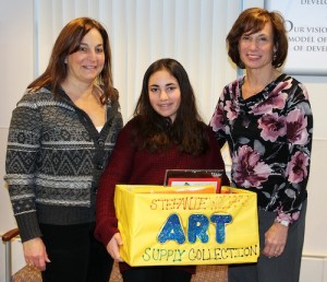 Stefanie Wolff holds one of many boxes of art supplies she donated to Matheny. At left is her mother, Susan Wolff; at right is Janice Kriegman, Matheny development officer.